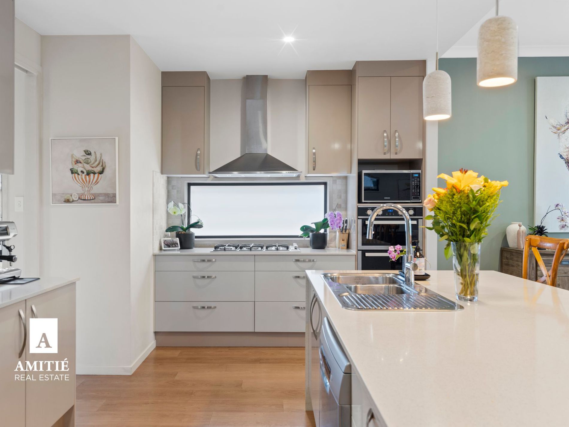 • Spacious kitchen overlooking indoor and outdoor living areas which exudes style and class – featuring stone bench tops, with stunning high quality pendant lighting, quality stainless steel appliances including wall oven and grill with 900mm gas cooktop, range hood, dishwasher and a walk-in pantry.