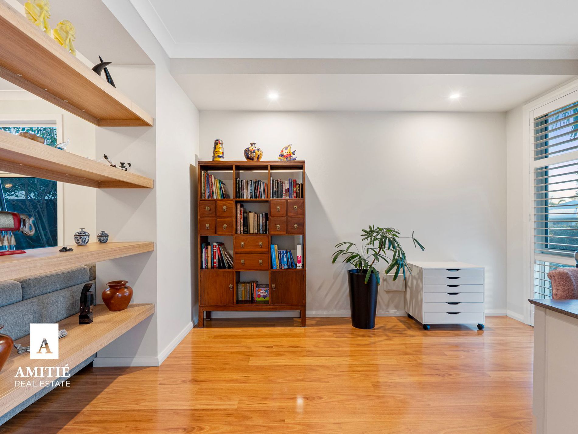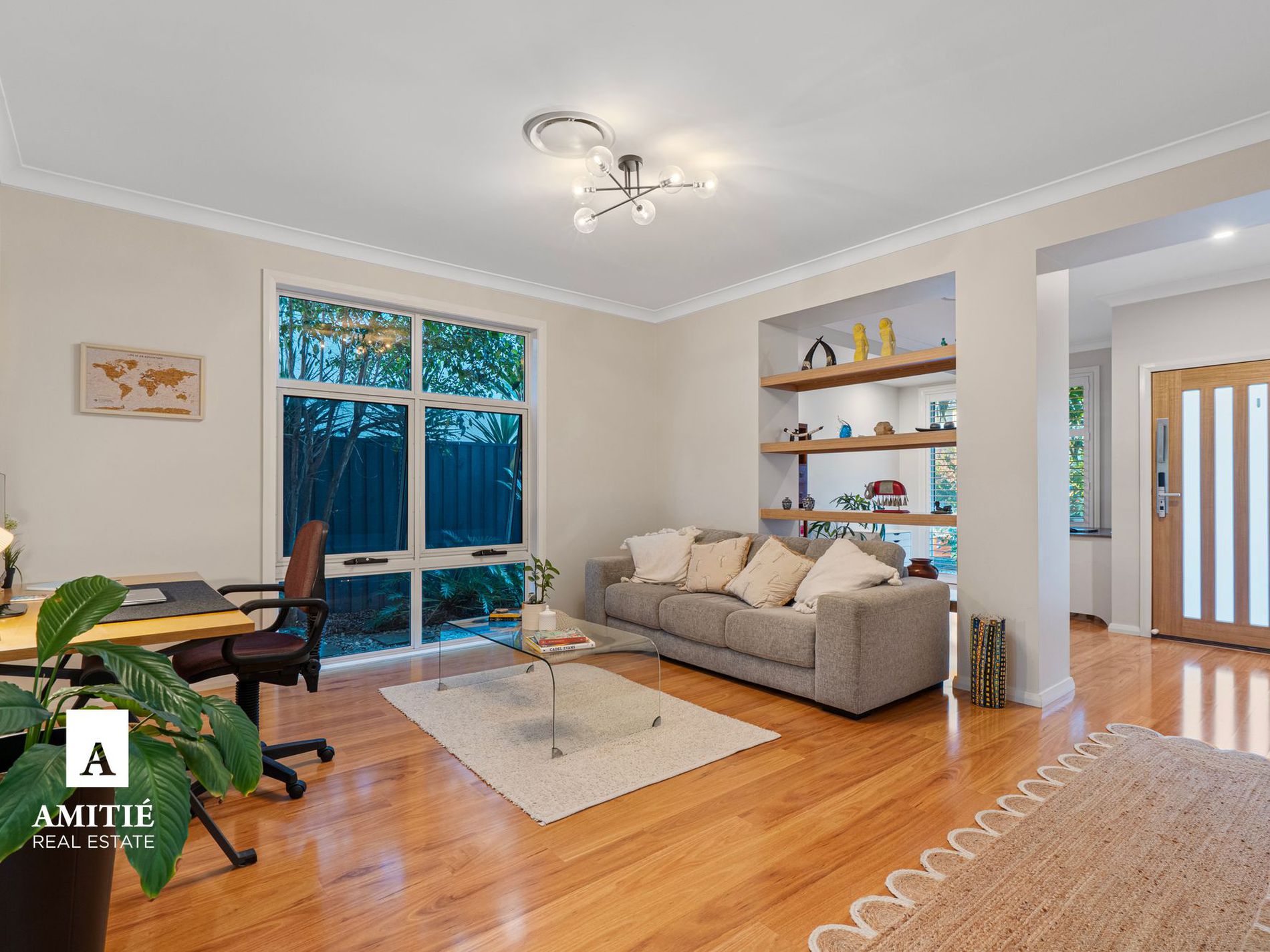 - Formal lounge and home office with built in shelving adding a touch of sophistication.